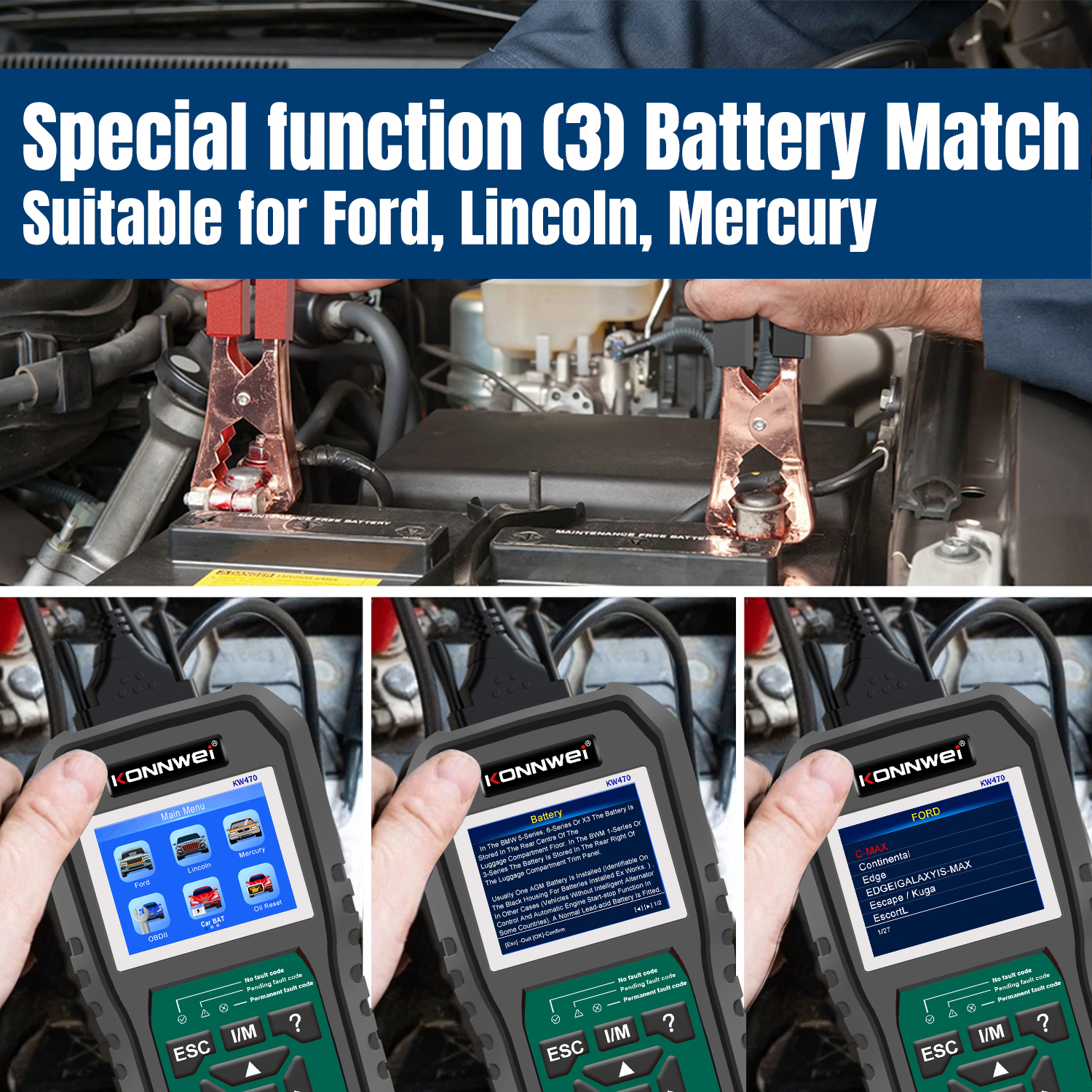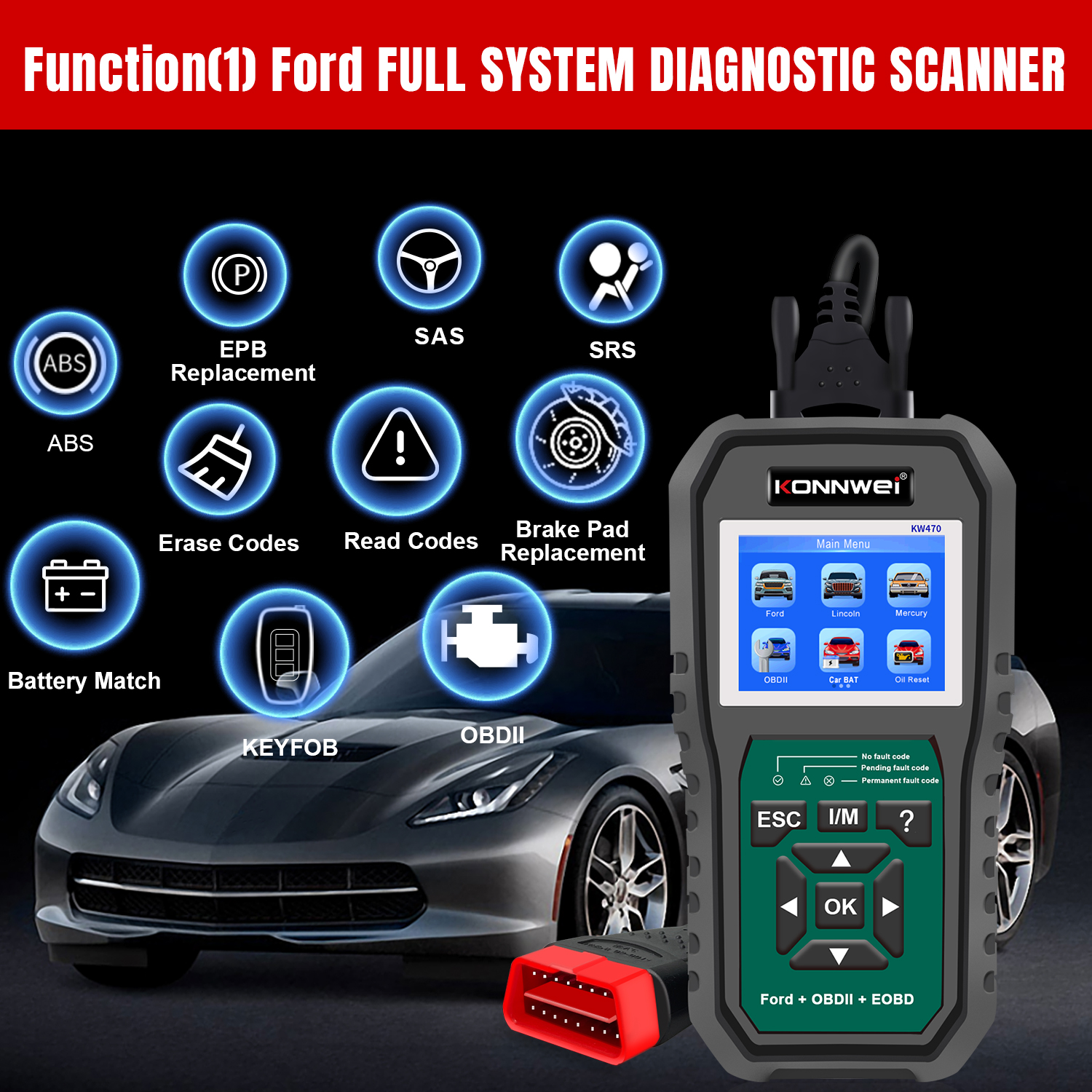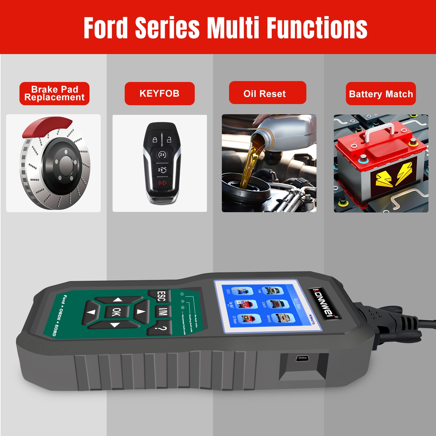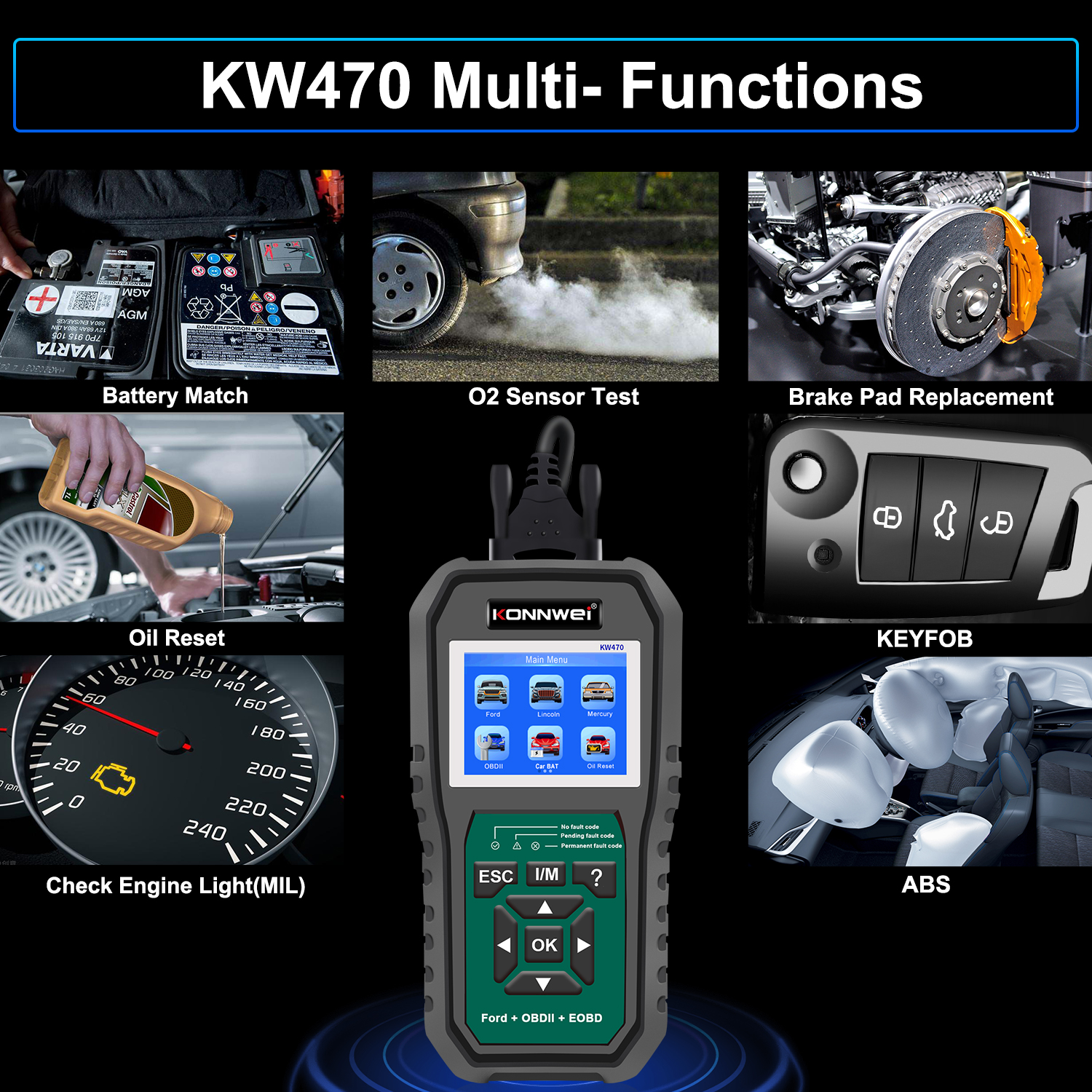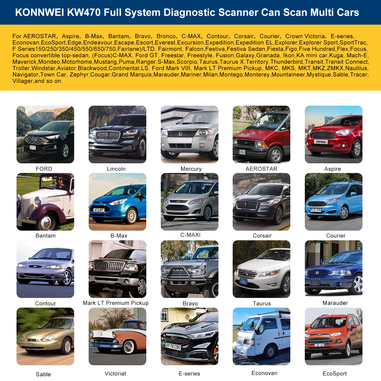 La herramienta de diagnóstico completa KONNWEI KW470 es compatible con más de 90 modelos de automóviles de la serie Ford. Soporta el diagnóstico de todos los sistemas, incluidos: