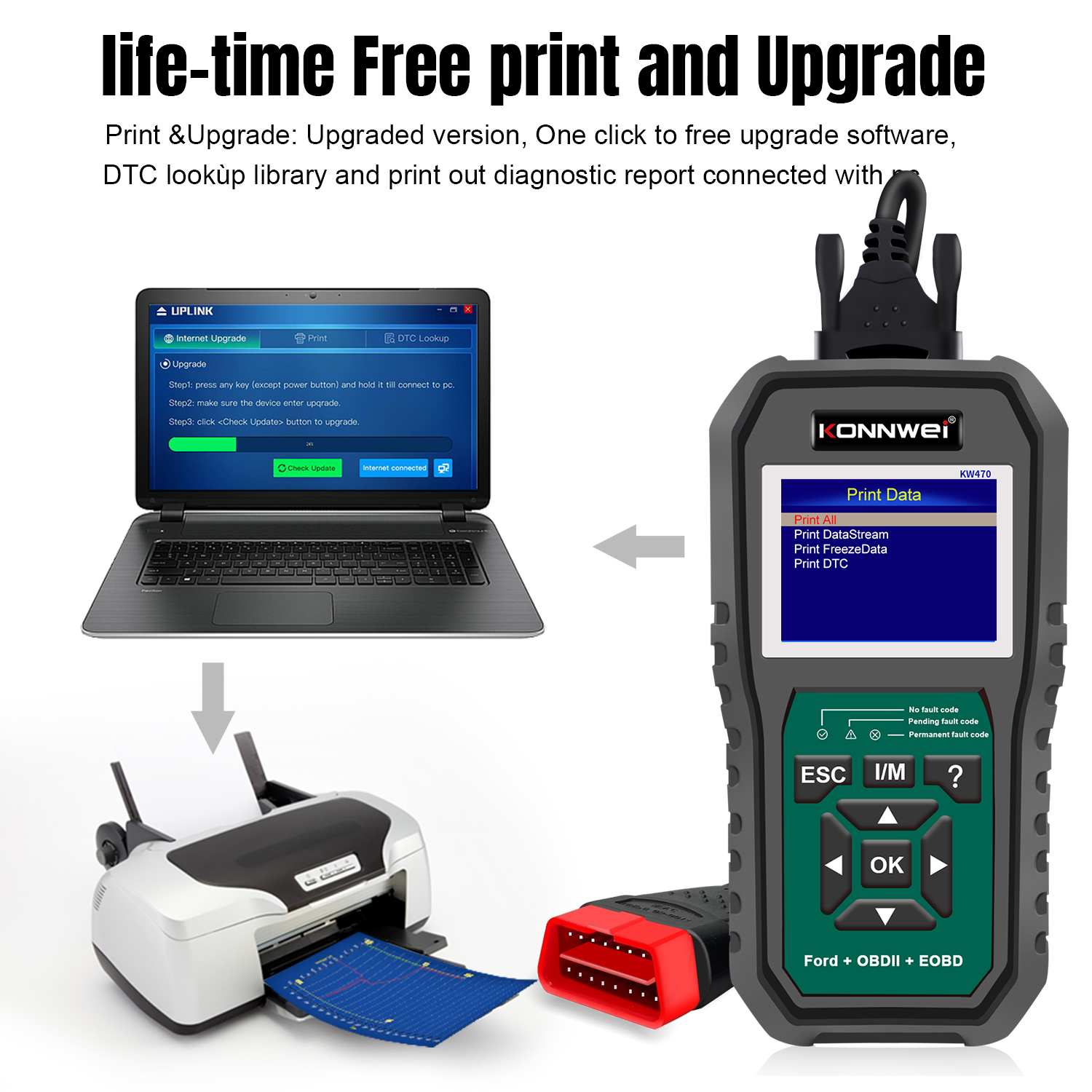 El paquete de regalo incluye la herramienta de diagnóstico KW470, el cable OBD2, el cable USB y el manual de usuario, con soporte para actualizaciones de software de por vida.