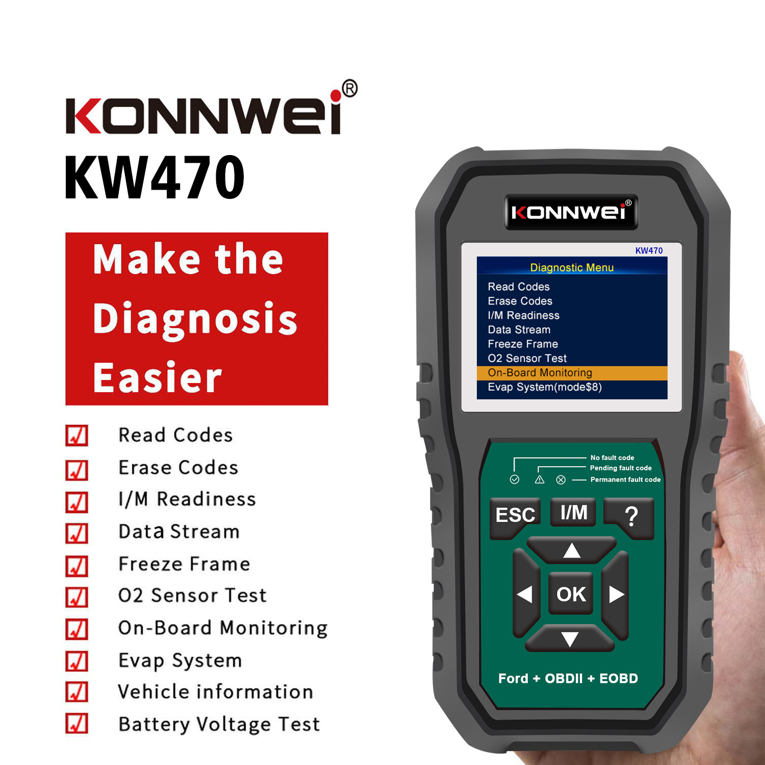 El lector OBD2 KW470 está diseñado para diagnosticar vehículos universales de 12V con 16 pines fabricados después de 1996. Este escáner de diagnóstico admite todas las funciones OBDII, que incluyen: