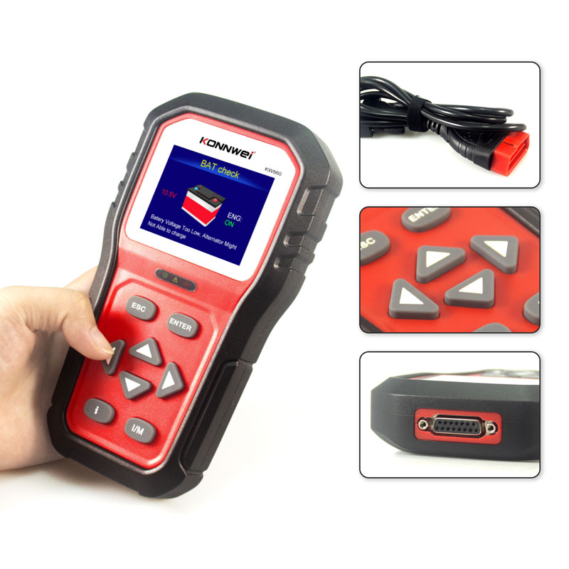 El escáner automotriz Konnwei KW860 es el equipo sucesor del KW850. A diferencia del modelo anterior, el Konnwei KW860 posee un botón informativo que le mostrará sugerencias para que pueda tomar la mejor decisión a la hora de reparar el inconveniente que este presentando su vehículo. Admite los 10 modos de prueba OBD2 en los protocolos genéricos soportados.